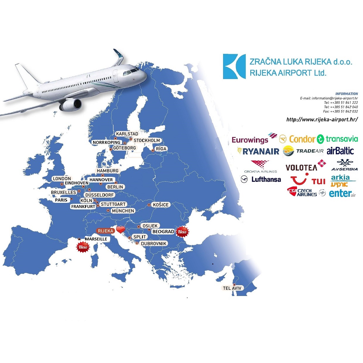 Da Rijeka l’airberlin offre voli di linea stagionali per Berlino-Tegel, Düsseldorf, Amburgo, Hannover, Colonia, Mahon, Stoccarda e Vienna, la Croatia Airlines per Londra-Heathrow, la Danube Wings per Bratislava e Kosice, la Helvetic Airways per Zurigo, la Norwegian Air Navetta per Oslo e Stoccolma-Arlanda e Tuifly per Berlino-Schönefeld e Colonia.