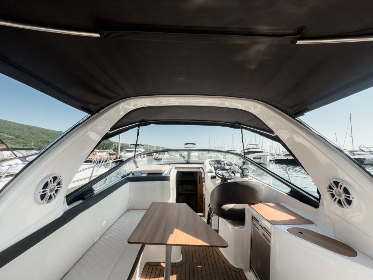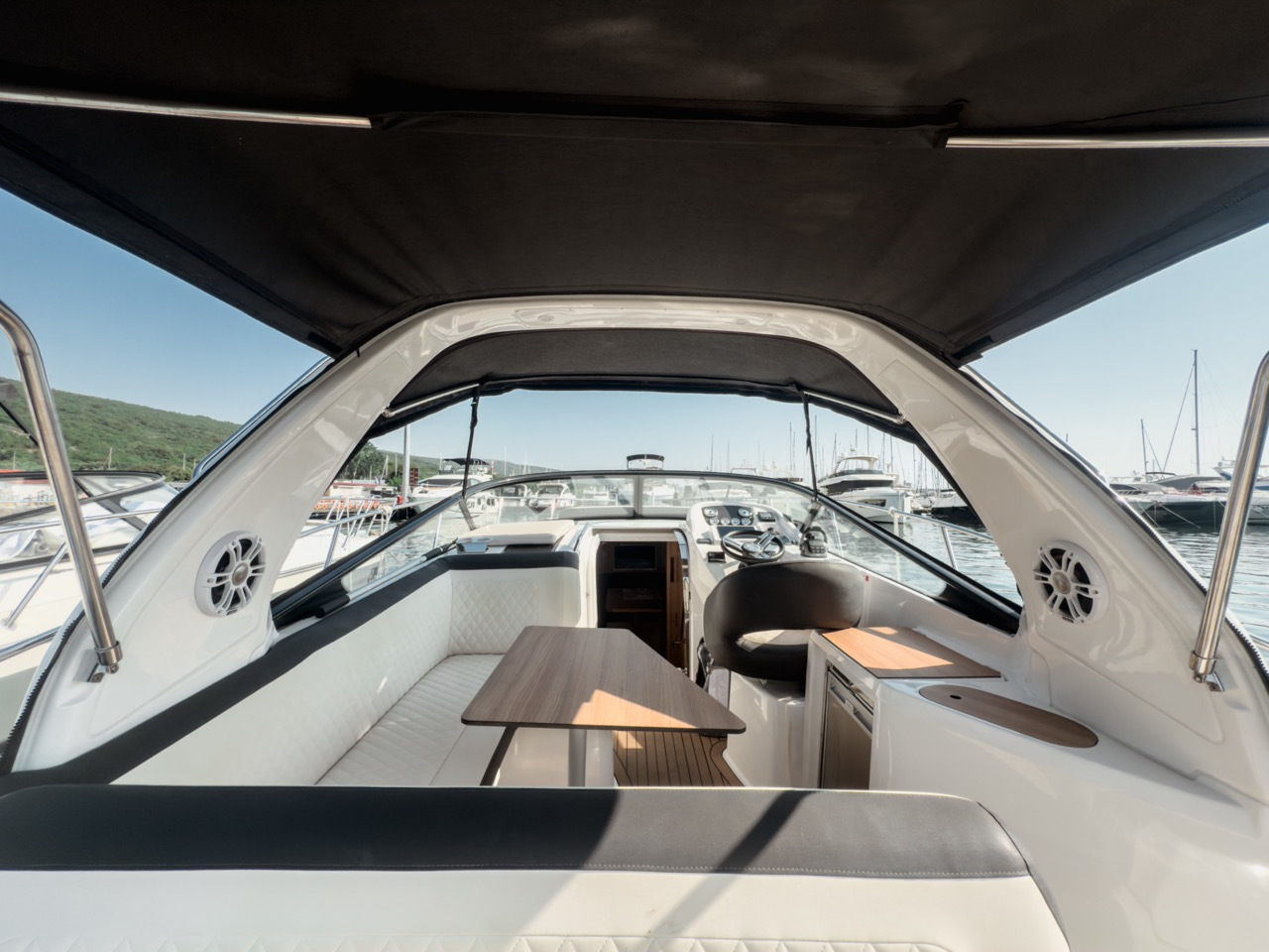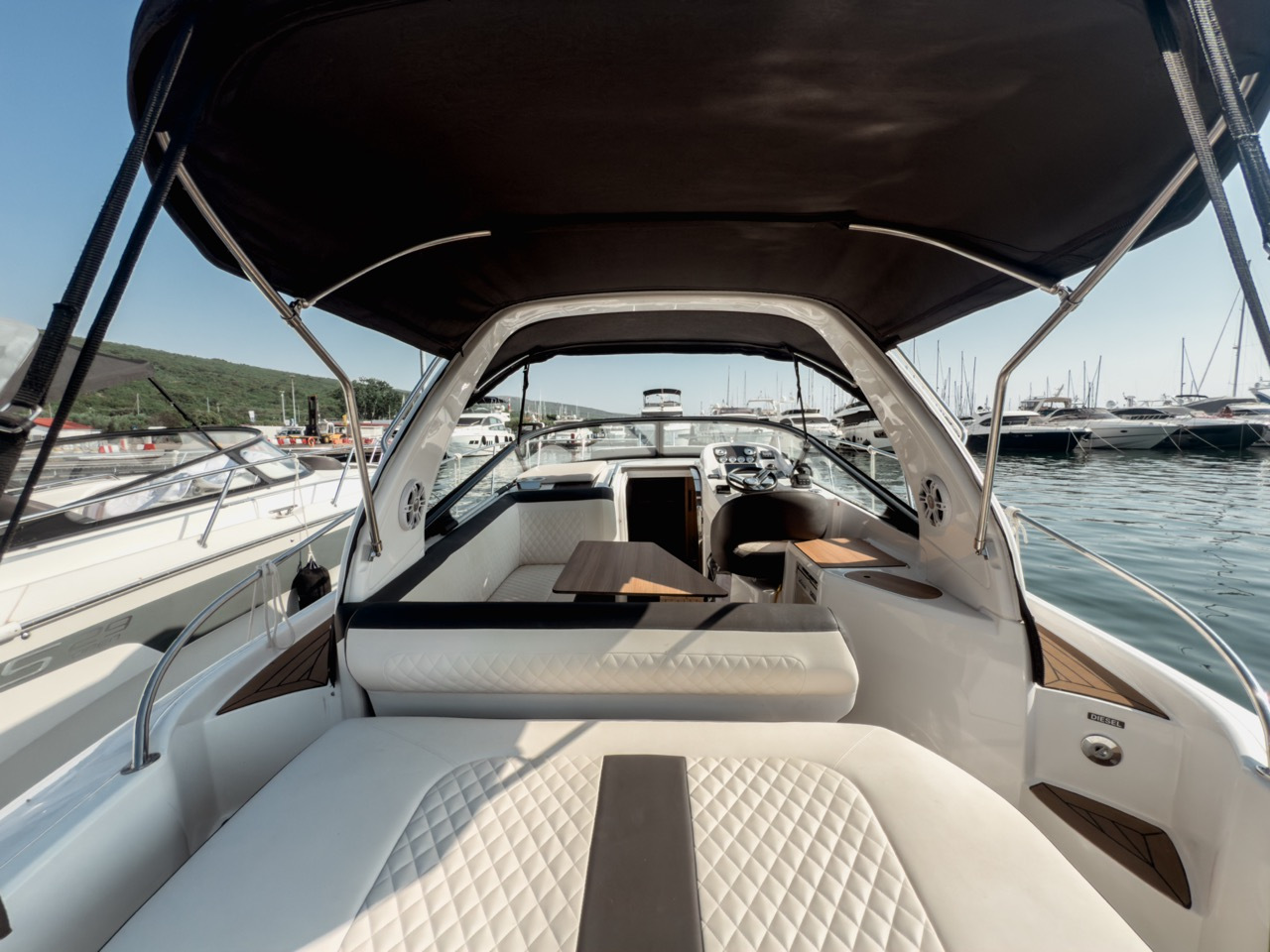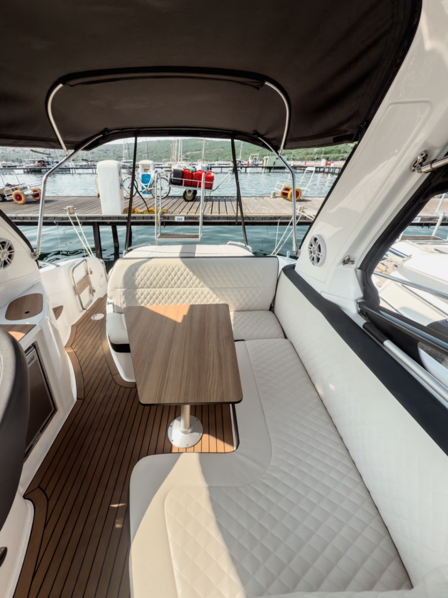 Der großzügige Innenraum mit deutlich mehr Stehhöhe, mit einer abgetrennten Achterkabine und einem nochmals verbesserten Toilettenraum lädt zum Wohlfühlen und Verweilen ein. Das Cockpit bietet neben einer großzügigen Liegefläche einen Sitzbereich für fünf Personen und eine funktionelle, gut ausgestattete Wetbar. Dadurch wird die Fahrt über das Wasser und das Baden in der Bucht zu einem unvergesslichen Erlebnis.