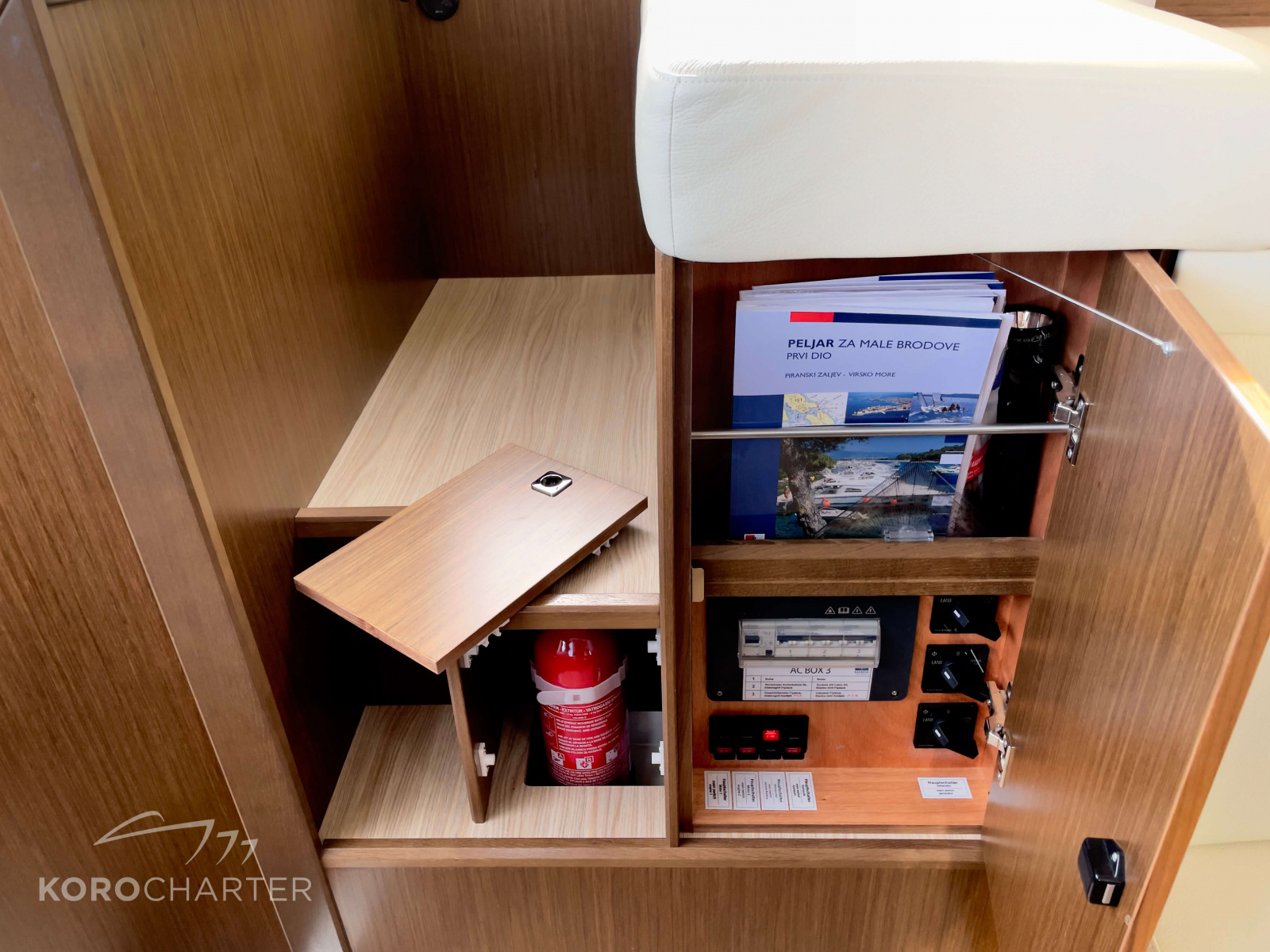 Feuerlösch-Anlage, Feuerlöscher, elektrische Bilgenpumpe, Rettungswesten, manuelle Bilgenpumpe, Rettungsring, Bilge-Alarm, Nebelhorn, Radarreflektor, Flaggen, Verbandskasten, Lifebelts, Notsignalmittel