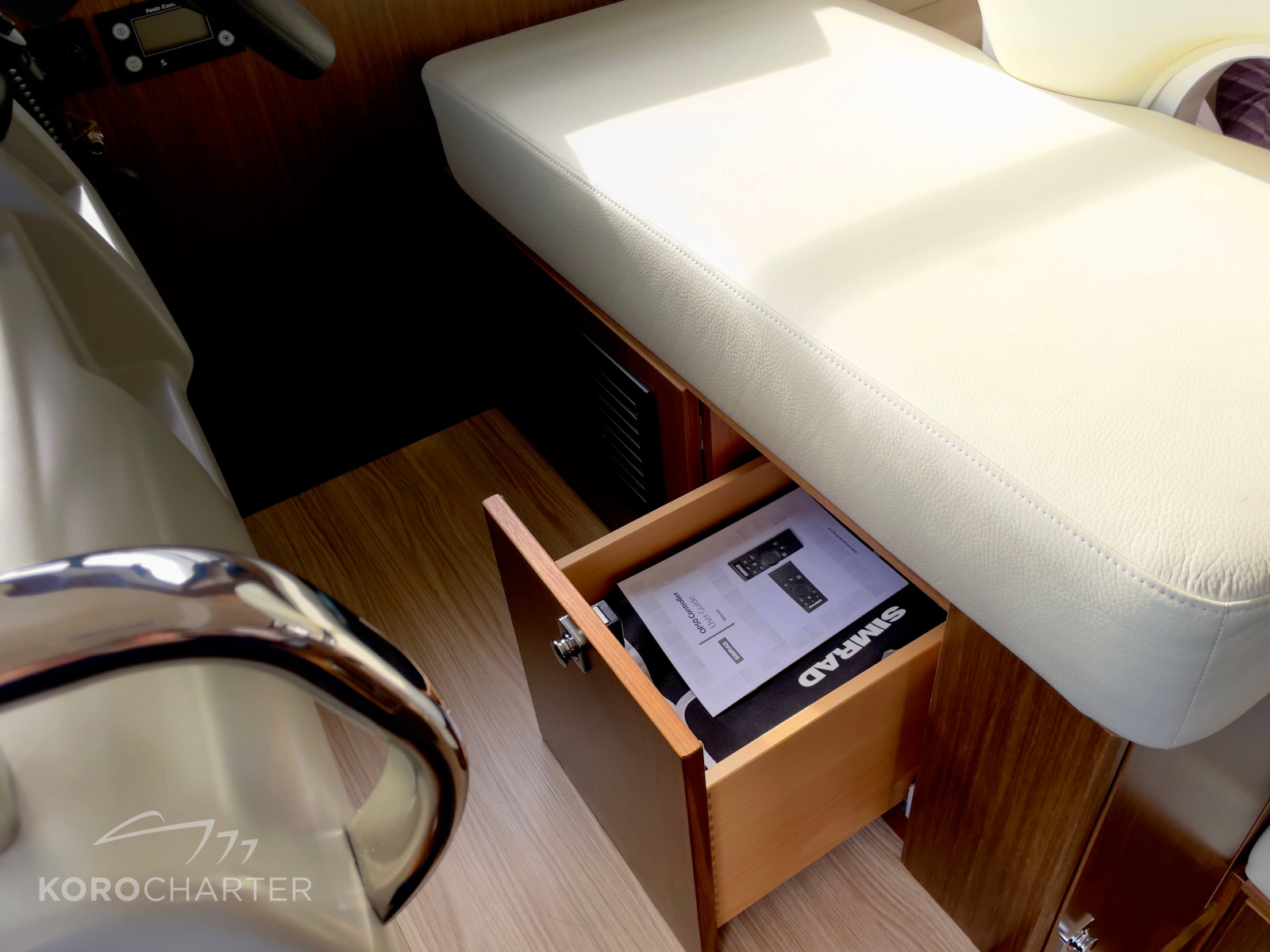 DPS (Dynamic Positioning System), UKW-Funk, GPS, Kartenplotter, Fernglas, Navigationslineal, Kompass, Log, Echolot, Drehzahlmesser, Ruderstandsanzeige, Hafenhandbücher, Seekarten, Positionslampen