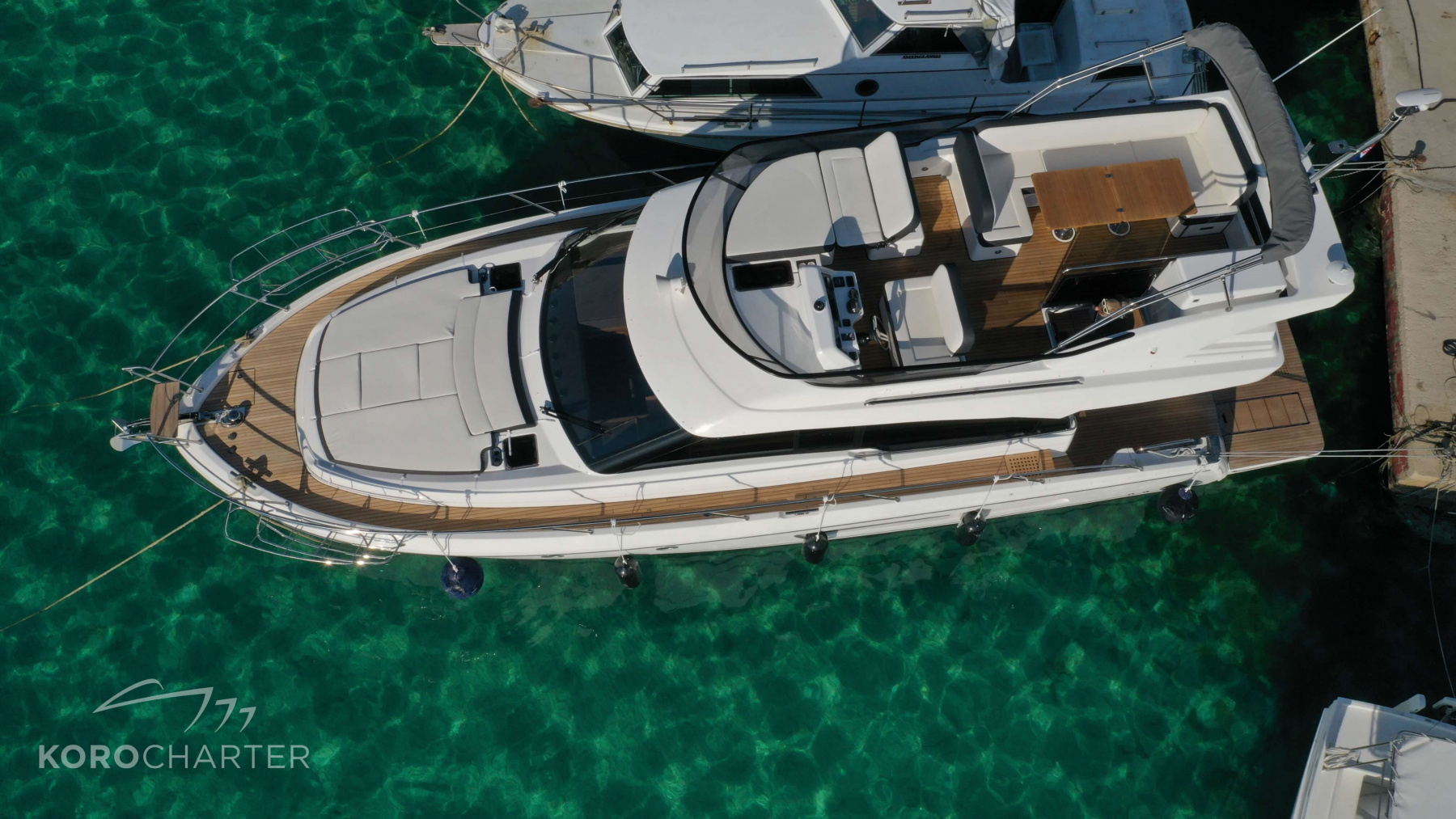 Bimini-Top, Sonnensegel über Flybridge, Badeleiter, Hecktür zur Badeplattform, Seereling, Deckdusche warm/kalt, Heckdusche warm/kalt, Teakdeck, Fender